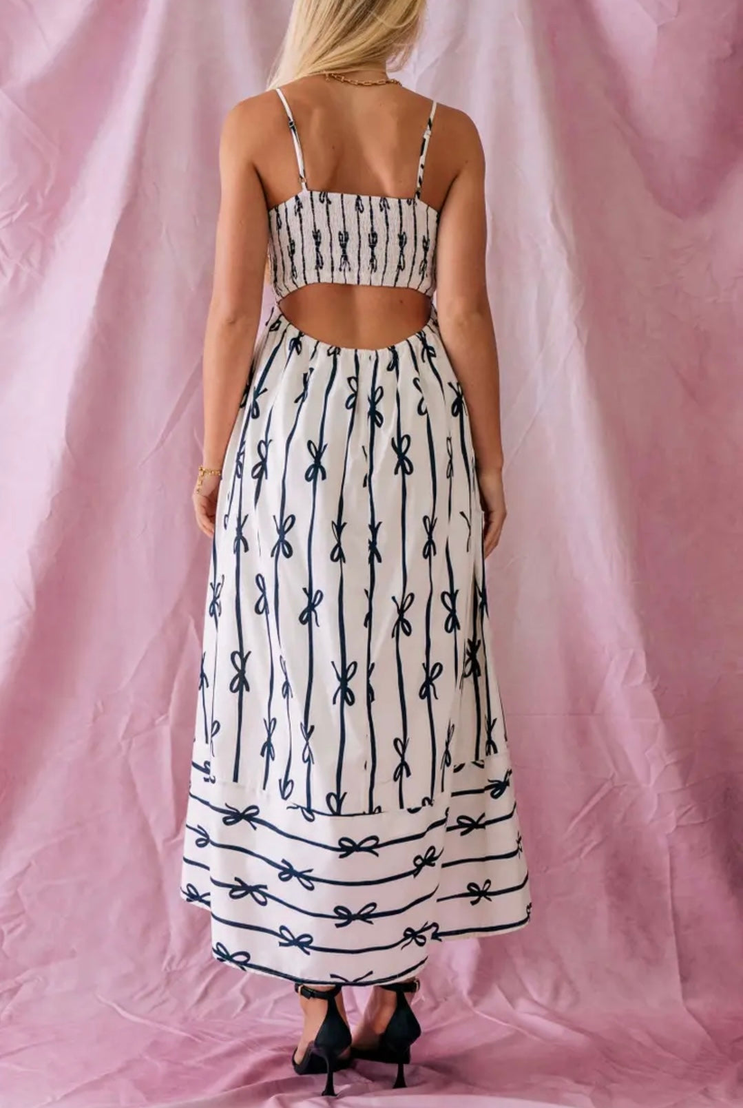 This playful maxi dress features a charming coral bow print on soft pink cotton, reminiscent of ribbons dancing across a summer sky. The smocked open back and full sweep skirt add romantic flair to this delightful piece.