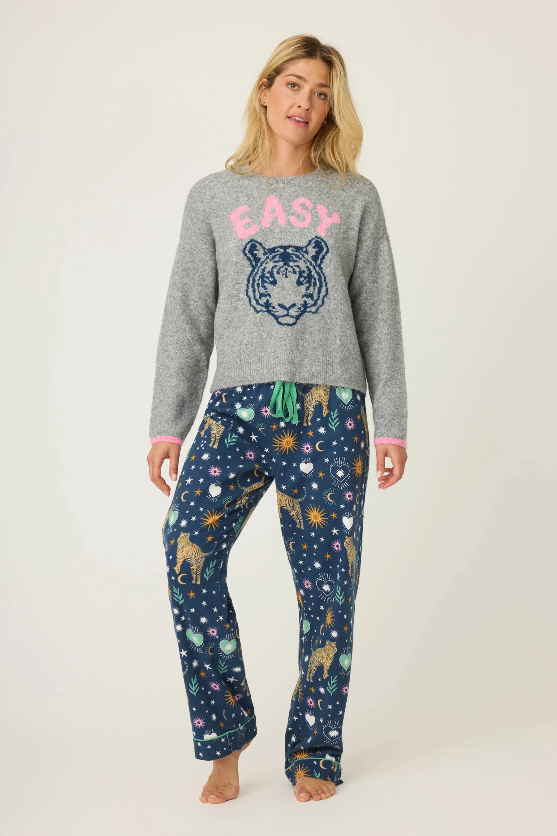 Soft, cozy, and made for lounging, this heather grey sweater is designed to be lived in. Crafted from plush sweater knit, it features a bold navy tiger graphic and a playful pink “easy” print. With a relaxed fit and stretchy fabric, it’s the perfect layer to throw on and never want to take off.