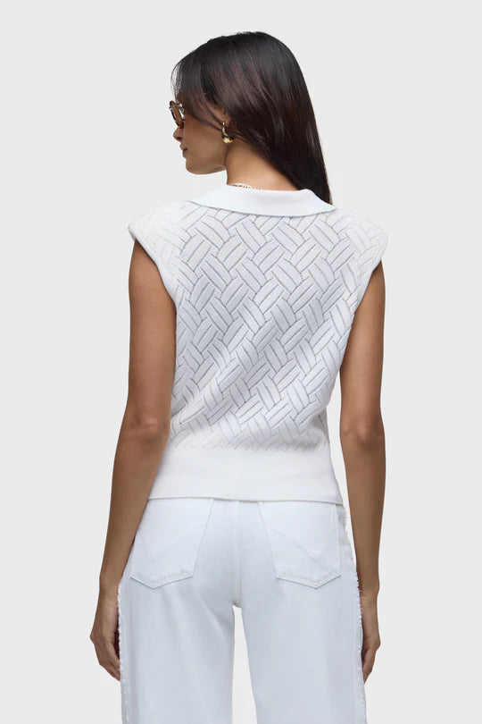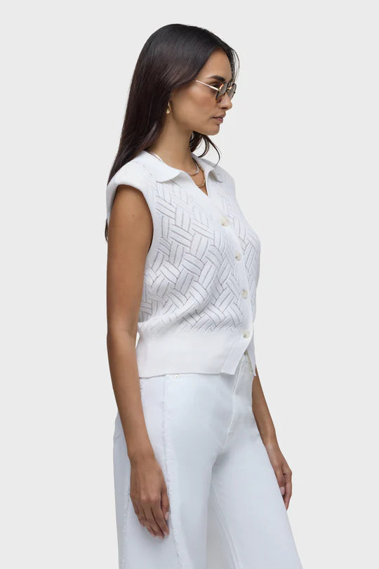 Crafted in a soft organic‑cotton blend, this sleeveless knitted top brings a refined twist to warm‑weather dressing. Designed with a button‑front placket, crisp collar, and subtle shoulder pads, it features an all‑over novelty stitch that adds texture and dimension. Fully fashioned for a smooth, high‑quality finish, it’s an effortless way to elevate your everyday look.