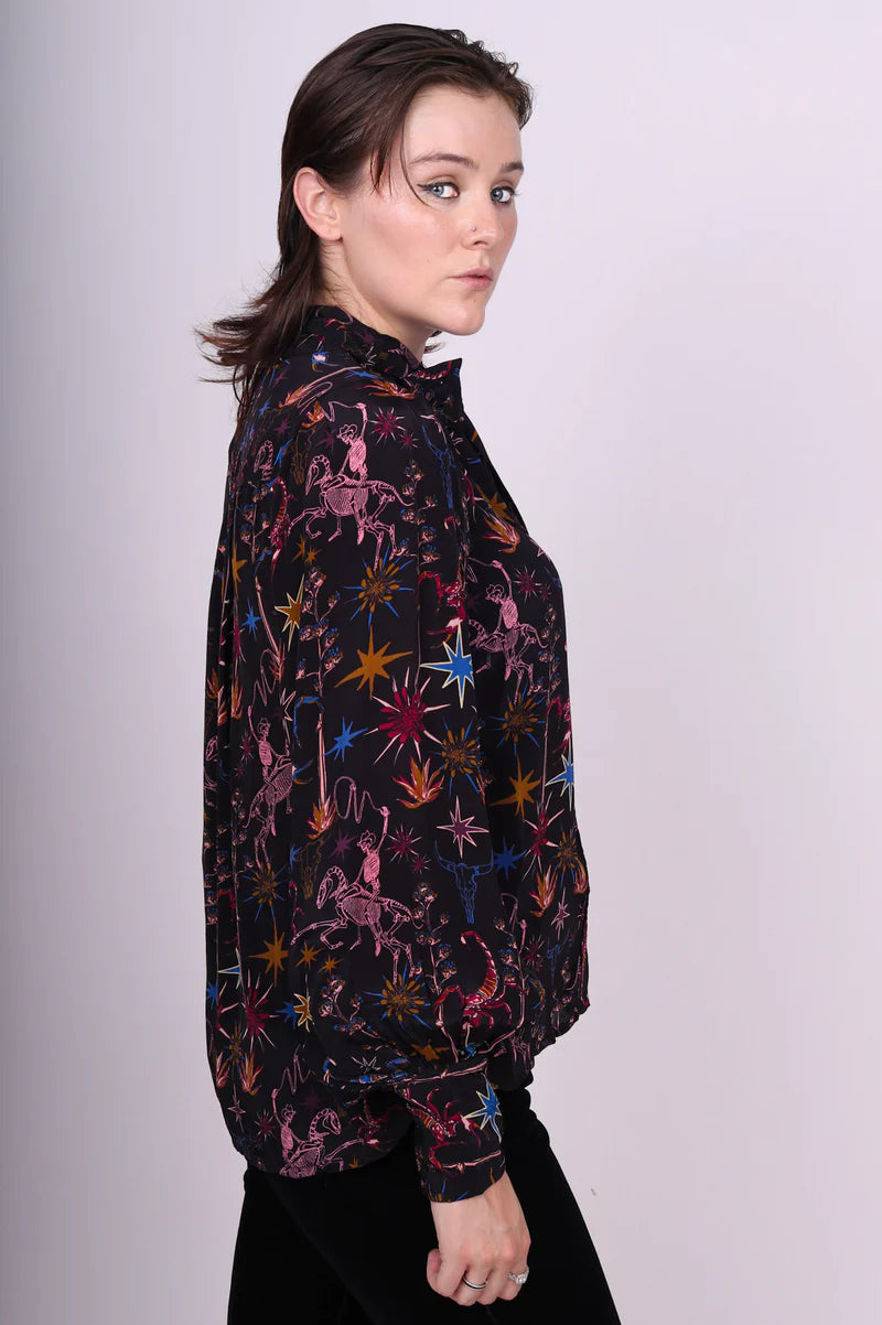 Ride in style with this striking 100% viscose top, crafted entirely from a printed fabric that celebrates the strength and spirit of the legendary ghost rider. The pattern features the ghost rider and his noble steed, along with wild west-inspired details like scorpions, bull heads, starbursts, and foliage in rich shades of red, gold, blue, and light pink.