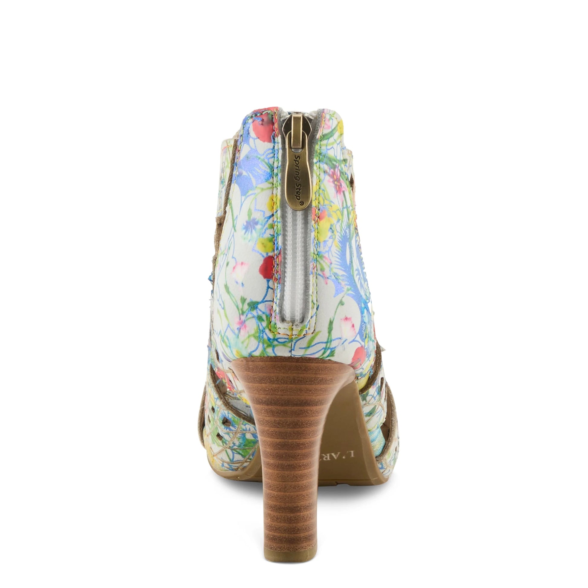 This enchanting shootie dances effortlessly between elegance and whimsy. The vibrant leather upper comes alive with hand-painted florals, artfully cut into petal and lattice patterns reminiscent of a garden in full bloom. Scalloped edges and floral detailing add a touch of fairytale romance, while the stacked-look heel provides graceful height. Finished with a back zipper closure and cushioned comfort, this shootie is as practical as it is poetic—perfect for weddings, garden parties, or any moment that calls for a little magic.