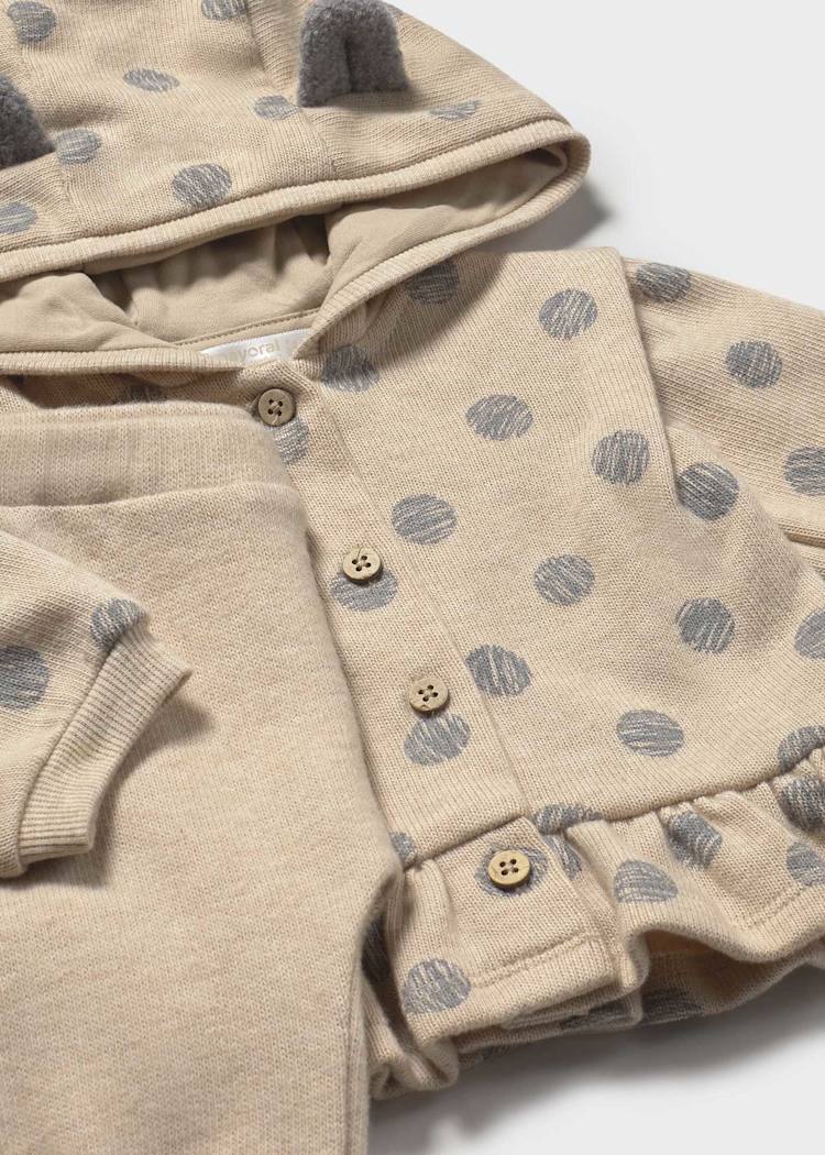 - A beige hooded jacket with a ruffled hem and soft polka dot print