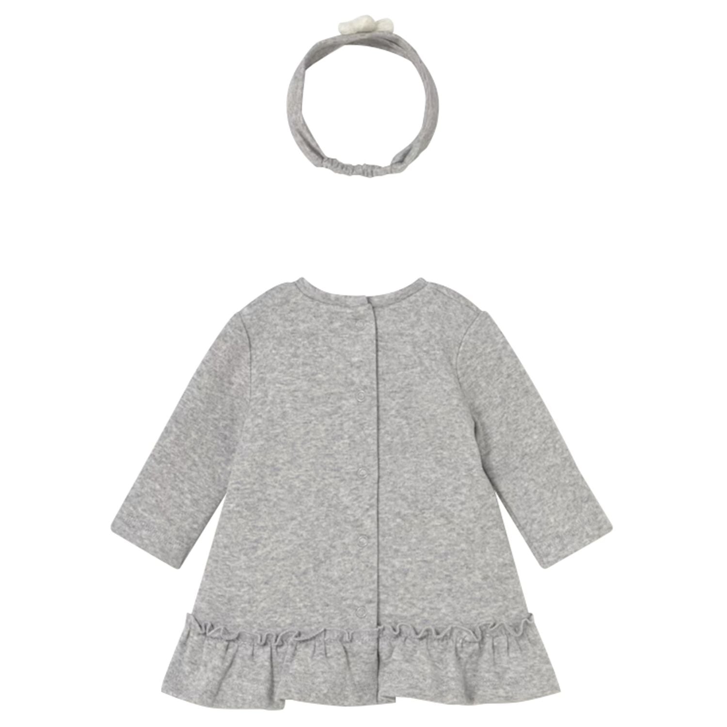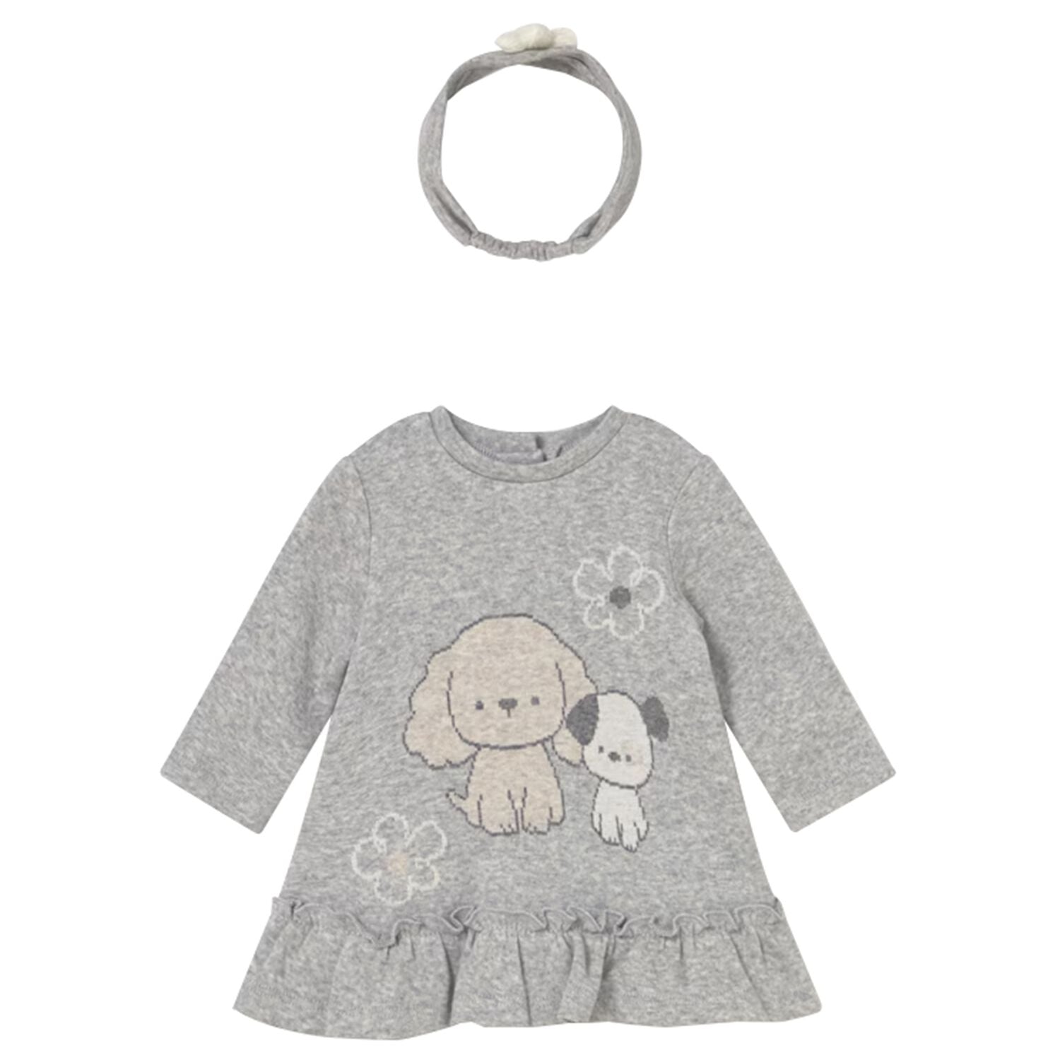Grey knitted dress for baby girls, made from soft cotton. It features an adorable design with two puppies and a flower on the front, a ruffled skirt, and convenient popper fastenings at the back for easy dressing. Comes with a matching headband adorned with a flower appliqué and an elasticated back for a comfortable fit.