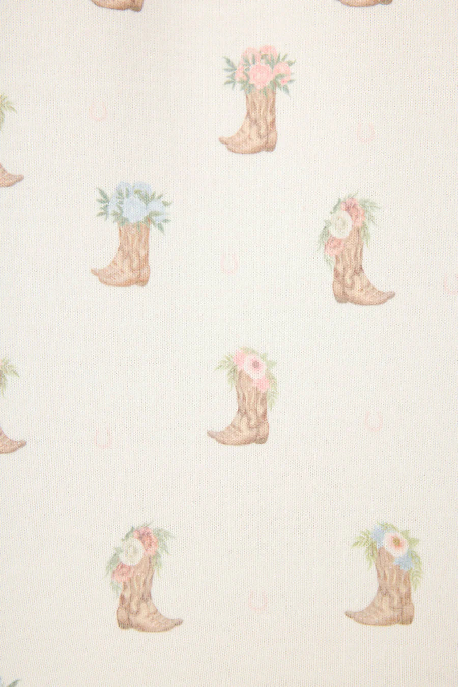 Get comfy in this charming loungewear duo. The pink slub‑jersey T‑shirt features a relaxed crew neckline, short sleeves, and a playful “howdy darlin’” graphic across the front. Paired with matching peachy‑jersey pants illustrated with Western boots and soft floral details, this set brings a sweet touch of Western whimsy to your downtime. The pants are finished with an elastic waistband, adjustable drawstring, and delicate scalloped trim for extra comfort and style.