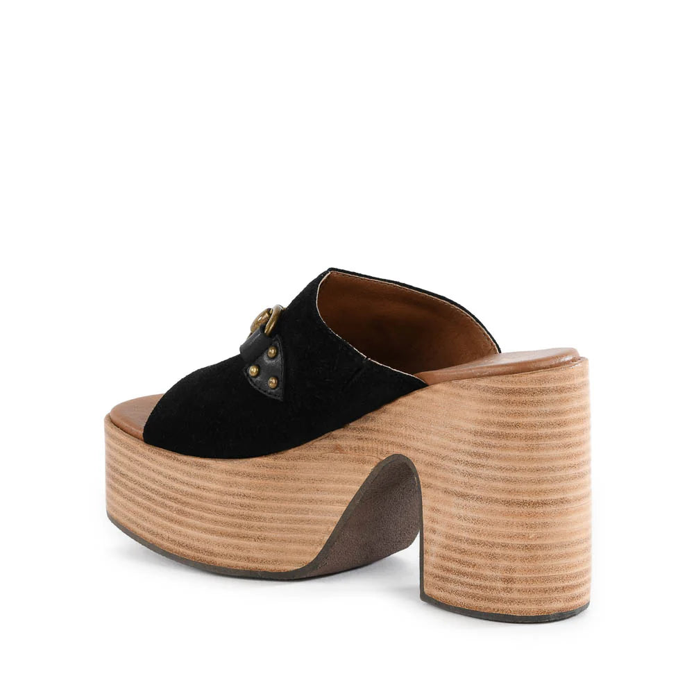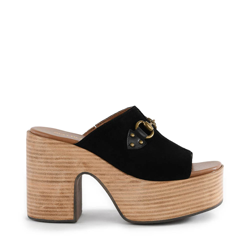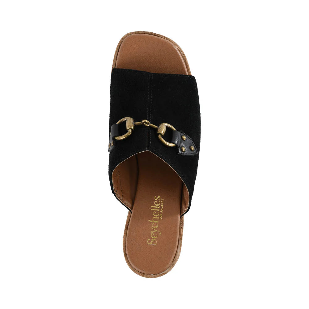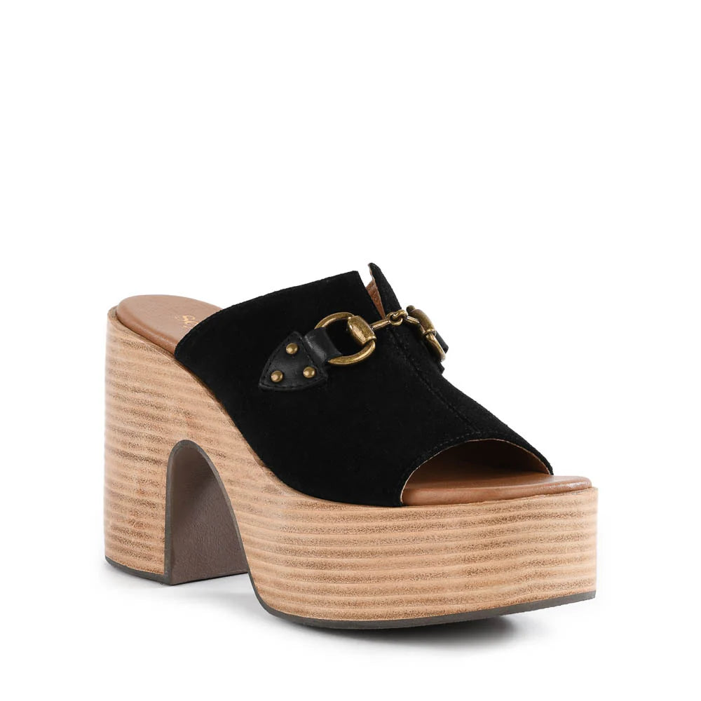 Make a bold yet timeless statement with these retro-inspired platform slides. Designed with a luxe suede upper and elegant brass horse bit detail, they blend vintage charm with modern sophistication—perfectly polished for dressing up or styling casually.